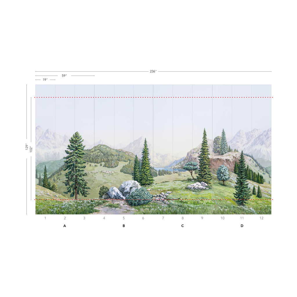 This decor is composed of 4 panels (A, B, C, D) of 59 inches wide and 129 inches high each, which are connected in an alternating way to create an infinite decor. The panels are cut into three 19 inch wide strips.