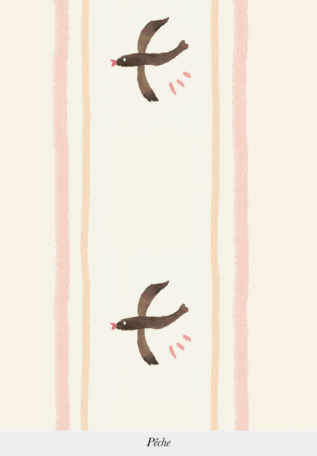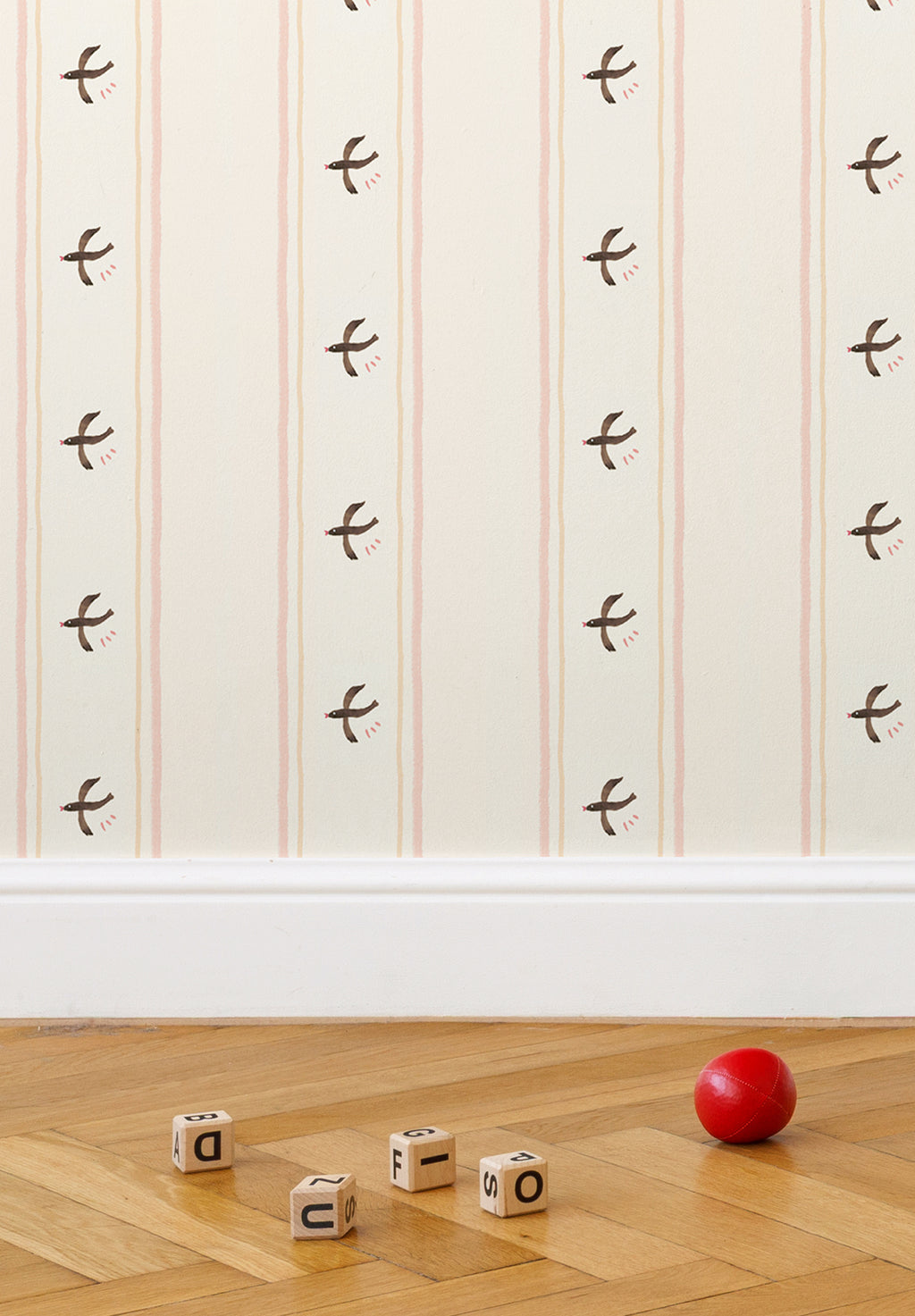 A soft stripe pattern dotted with little birds, hand-painted in a naïve and joyful style. A sweet and poetic design that brings lightness and gentleness to little ones’ bedrooms.