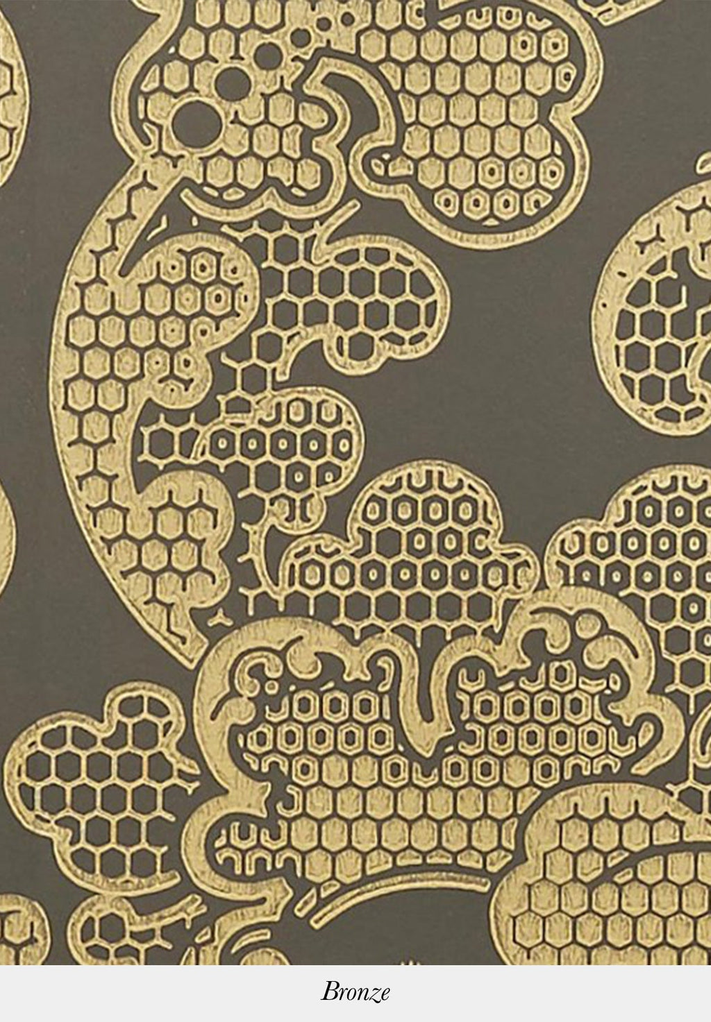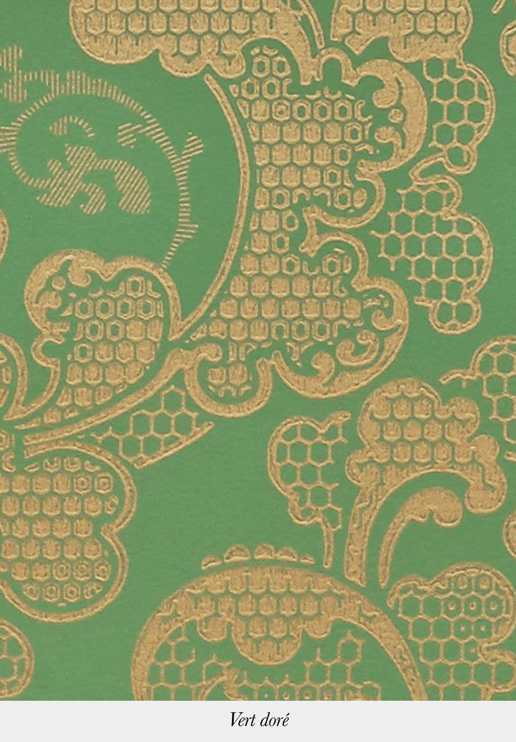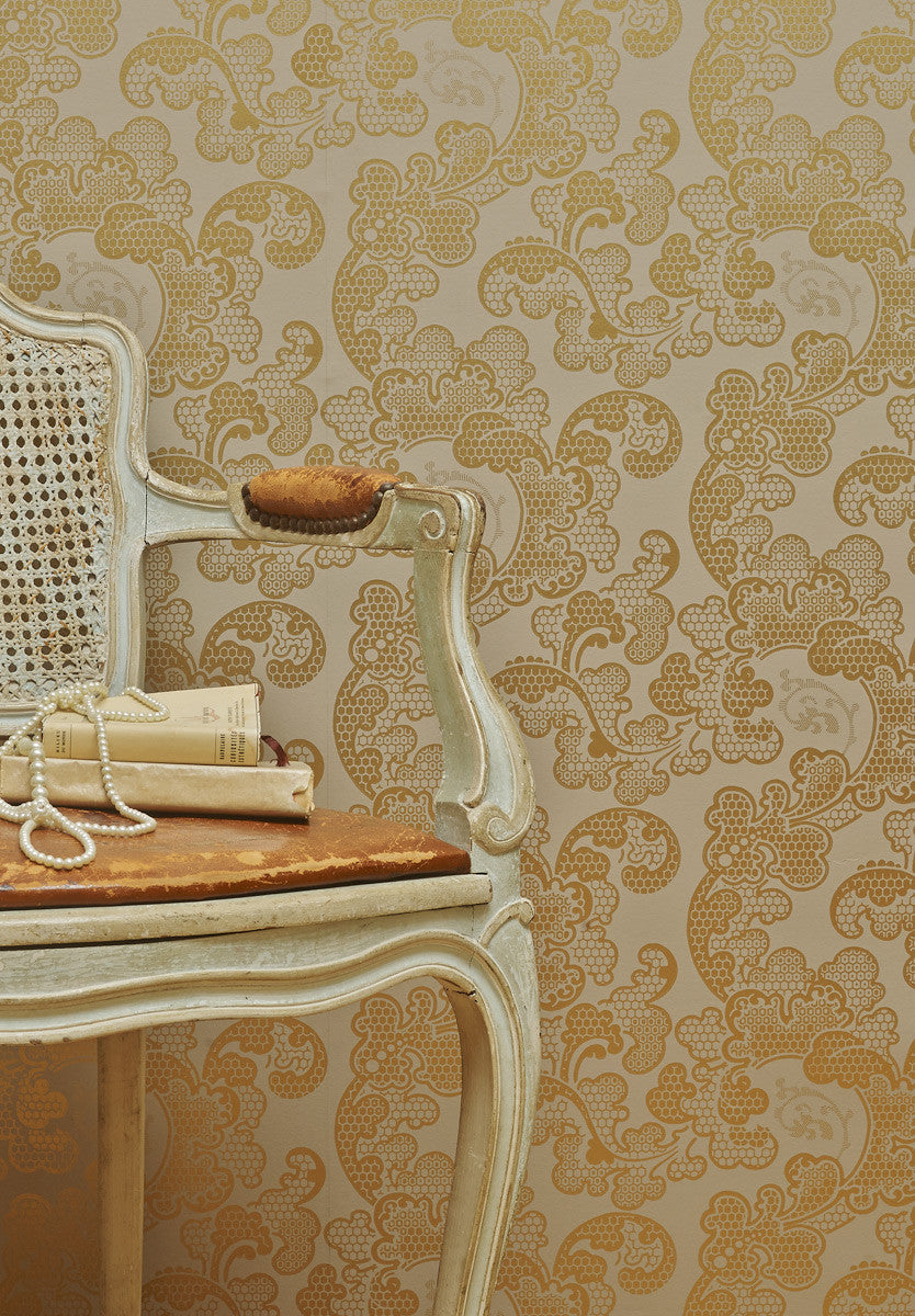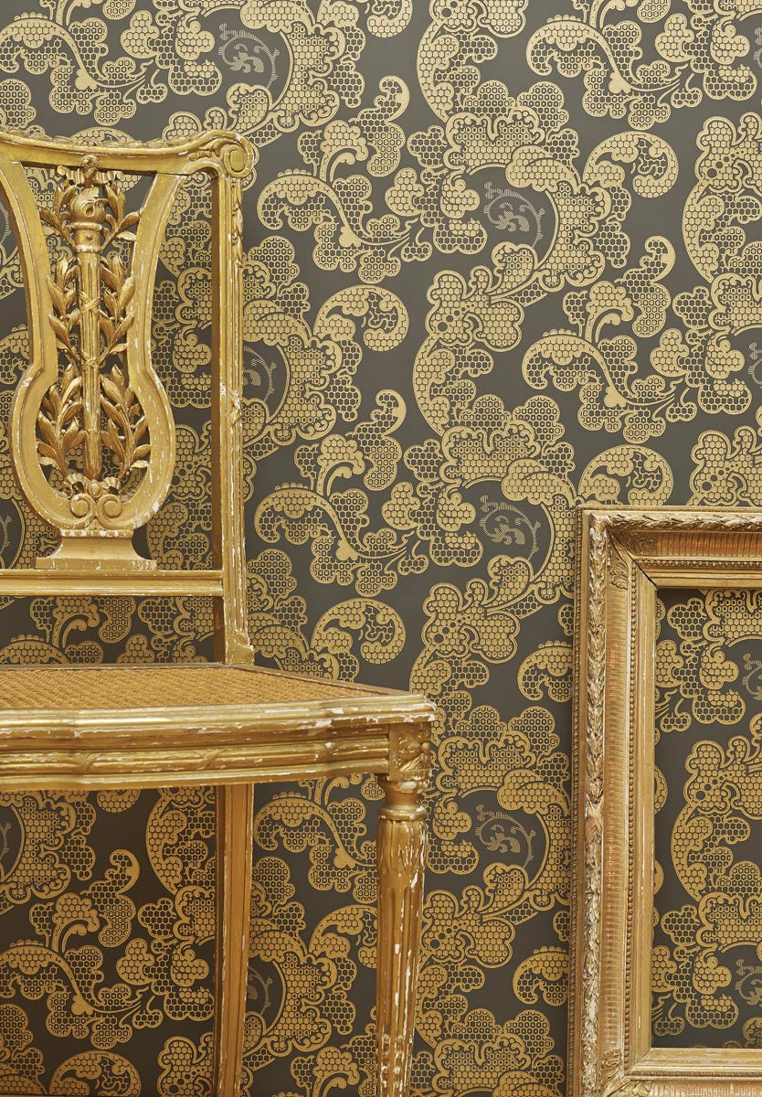All curves, this wallpaper is punctuated by the undulations of a luxuriant foliage with clusters of fleshy flowers. The metallic accents underline the multiple, more or less pronounced cells which give it a certain elegance.
