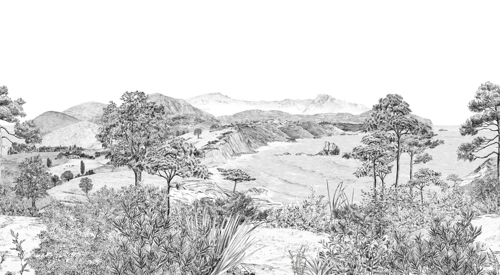 Between cliffs and golden sandy beaches, mountains and lush green hills, this setting takes us back to the marvellous Basque landscape with its unique contrasts. Created by Martine Dubreucq and Isabelle Parmentier, this large 6-metre panorama is crafted in pencil and pen in a grayscale atmosphere. The seaside and mountainside come together, inviting us on a refreshing and unforgettable journey.