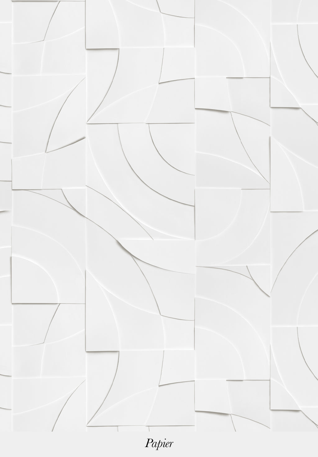 Lounge creates a pattern inspired by a 1930s model in the form of a panoramic design. The variant made of paper cuts features a relief motif with its play of light and shadow.