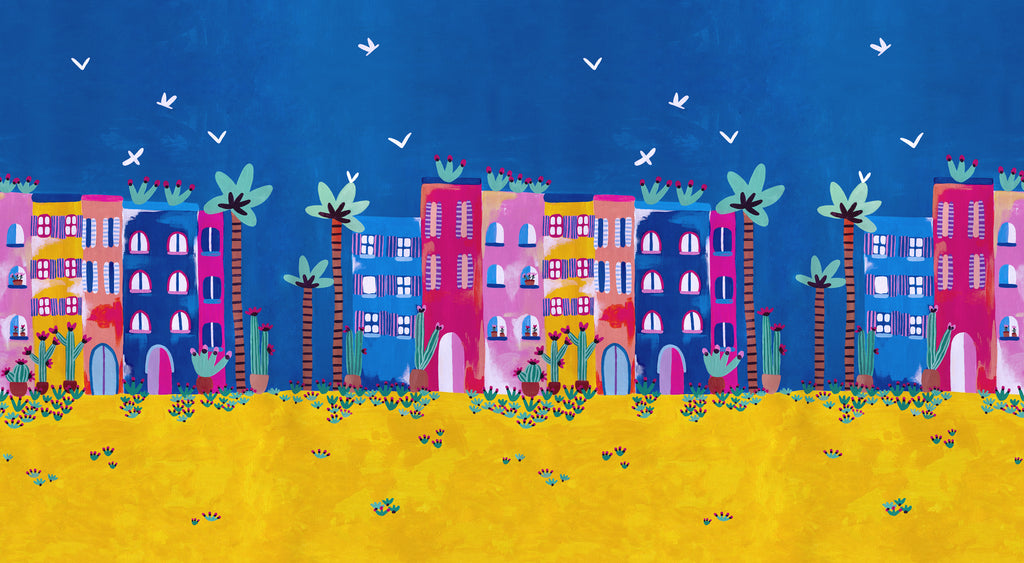Marrakech is a panoramic decor based on a work by Lison Baugé. This painting was done with acrylics, using a finger and a knife, a technique to remember the authenticity of the beautiful facades. Lison's colorful universe brings out all the warmth and light in this setting.