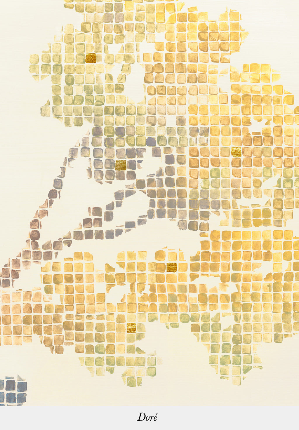 This wallpaper evokes the lightness of a sunlit vegetal landscape. Each touch of color has been hand-crafted using a simple carved potato. Each mark becomes a small tile, gradually forming a subtle mosaic.