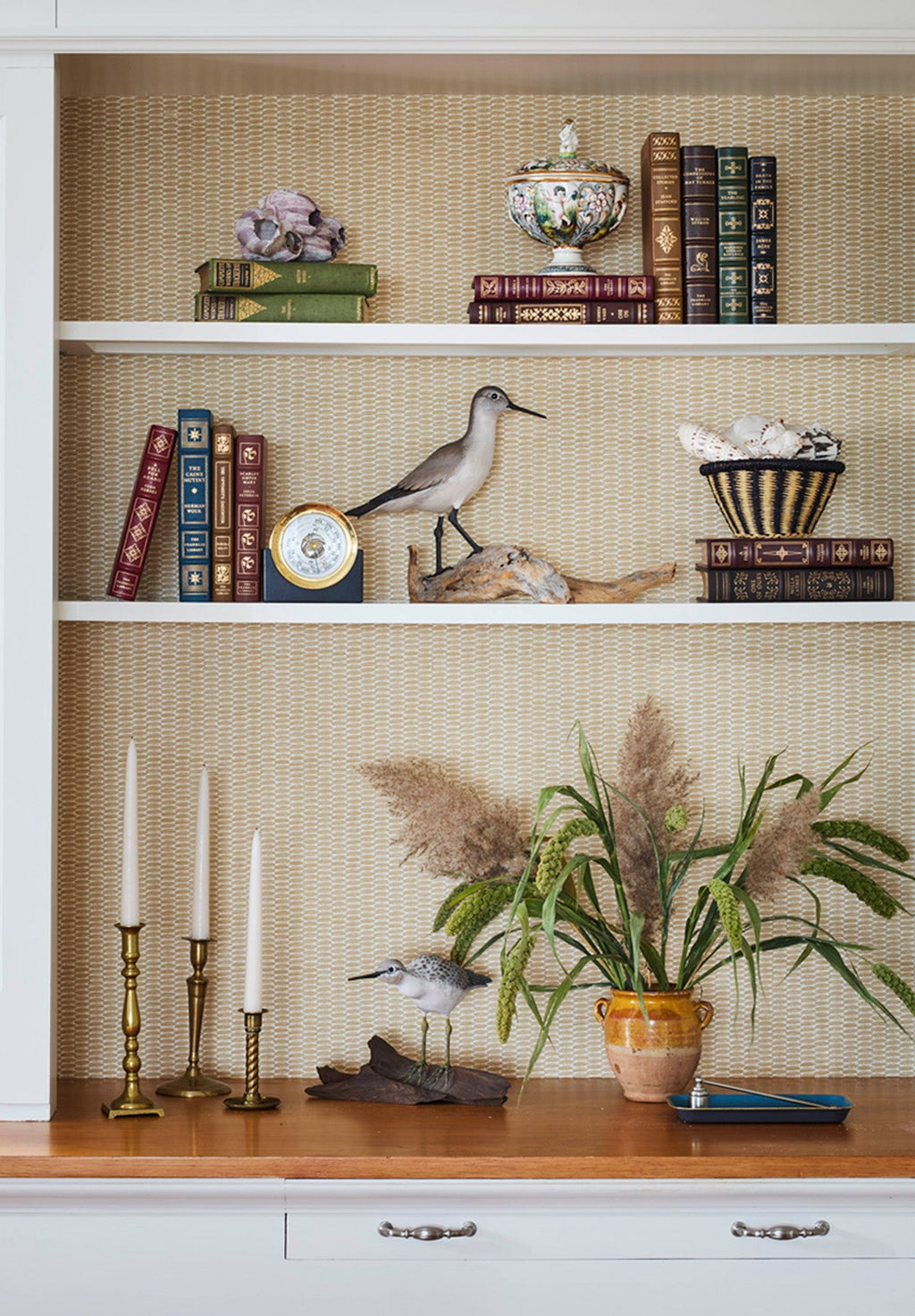 This wallpaper is a stylized, painterly interpretation of a Nantucket basketweave, capturing the texture and rhythm of traditional island craftsmanship in a warm, contemporary way. Rather than replicating the basket pattern literally, it translates the woven structure into a series of soft, hand-brushed motifs arranged in a loose, geometric repeat. Warm and organic. Textural without being heavy. Discover the border that matches the pattern.