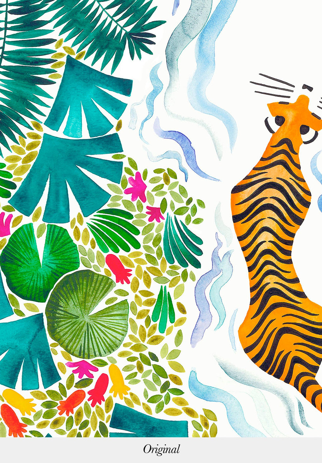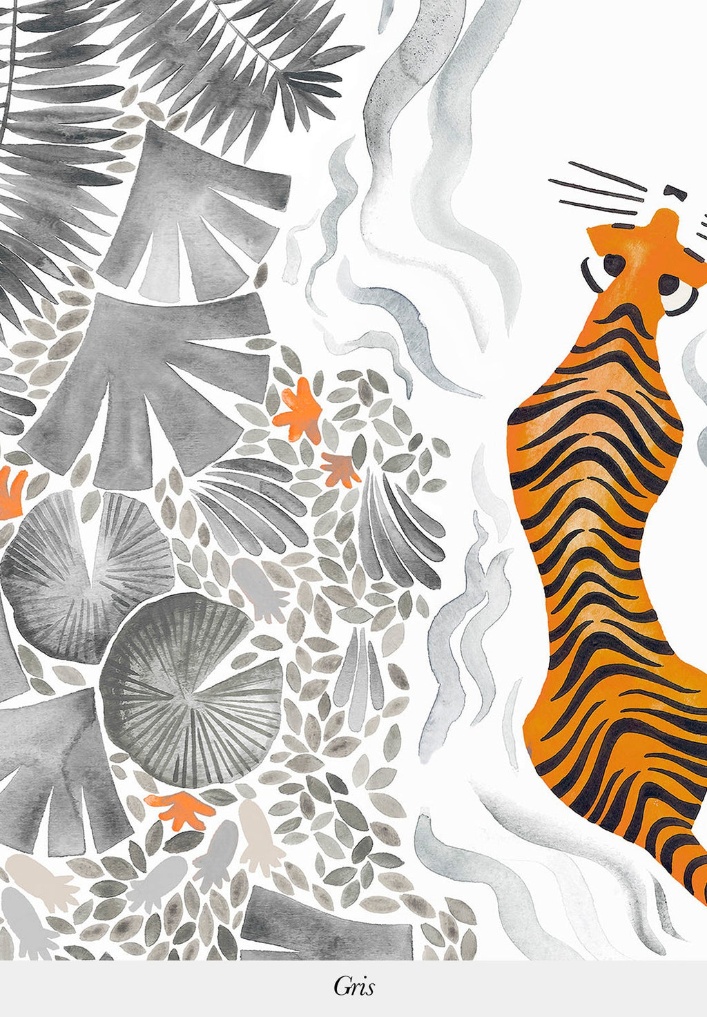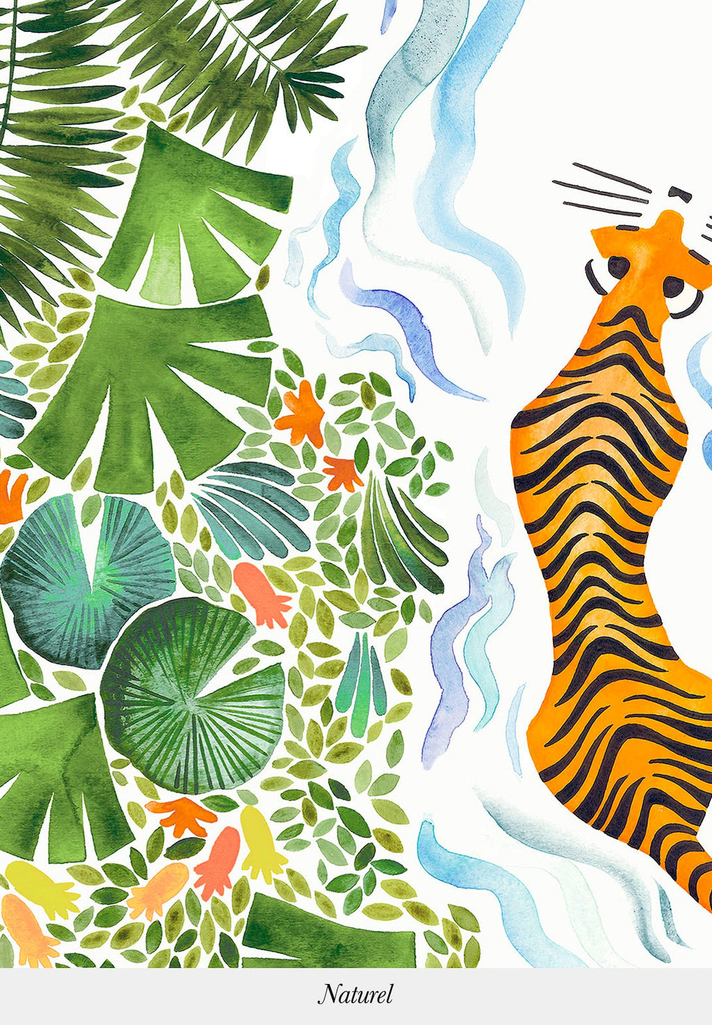 This panoramic decor is the result of a collaboration with Émilie Bouguereau, a Parisian artist who draws inspiration from her many trips to Africa to enrich her artistic universe. For a long time she accompanied her father, a wildlife photographer, on his safaris in Africa, which naturally set the tone for her creations: fauna and flora. With her very own style, we never cease to travel through her watercolor paintings which show a joyful, naive and colorful nature. This model makes us want to wander through the foliage and the river and meet these superb creatures: the tigers._____________________________________________