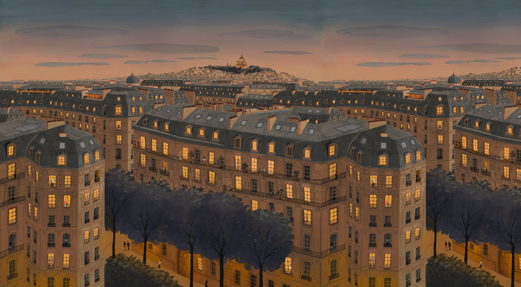 Through the windows of the flats, the streets, and the distant perspective, we discover Paris alive. Contrasting these large brushstrokes with small painted details, this image allows us to take a deep breath of air and contemplate this magical city with serenity.