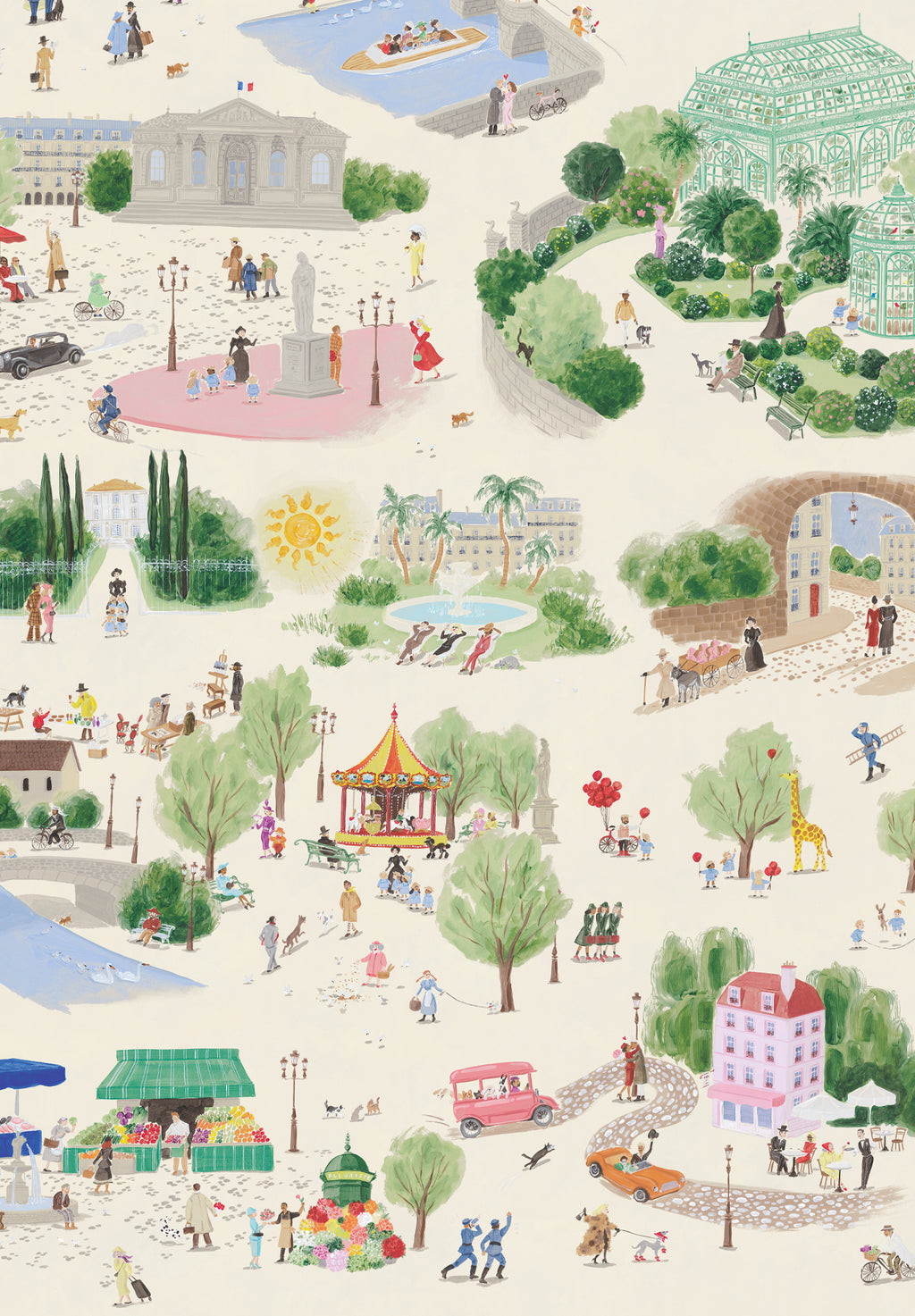 From one scene to the next, your eyes wander: through a sunlit garden, past a colorful flower market, by chatty antique dealers and cheerful dogs frolicking about. Further on, vintage cars drive by, a carousel turns to music, and café terraces come to life...